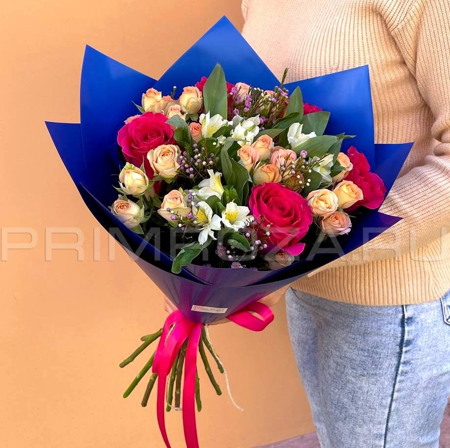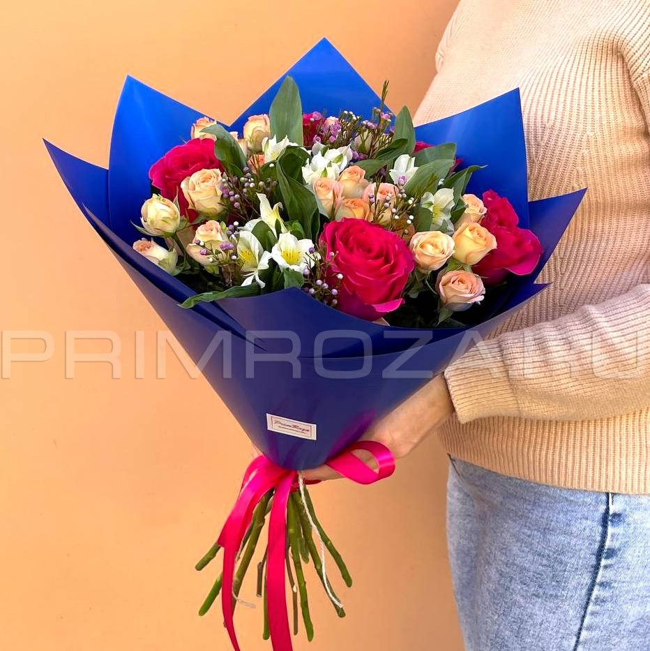 Роза - 5 шт, Альстромерия - 3 шт, роза кустовая - 5 шт, хамелациум - 2 шт