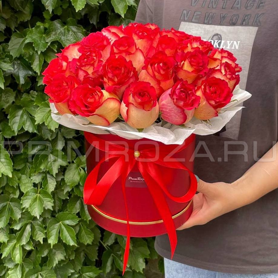 Букет из 25 роз в декоративной коробке. Наличие товара уточняйте у консультанта или по указанным телефонам. С радостью ответим на все ваши вопросы.