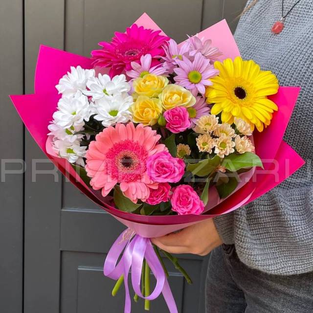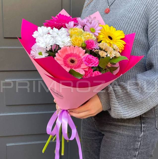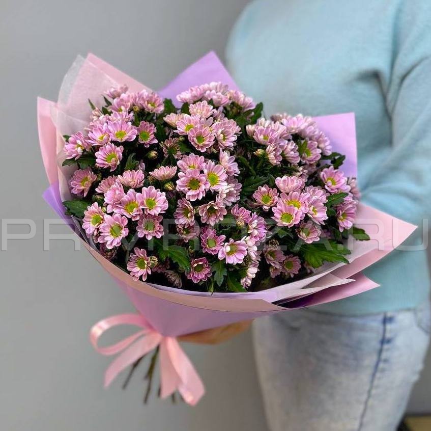 Букет из кустовых ромашковых хризантем и хризантем-сантини с оформлением в упаковку.