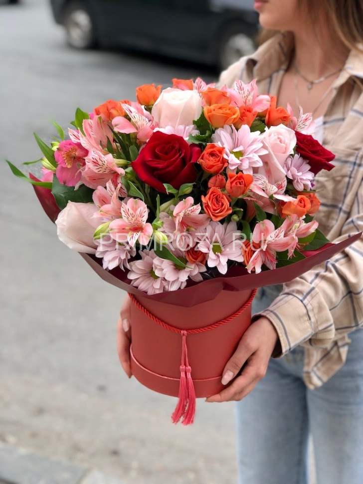 A bright composite composition in a decorative box. Check the availability of the goods with the consultant or by the specified phone numbers. We will be happy to answer all your questions.