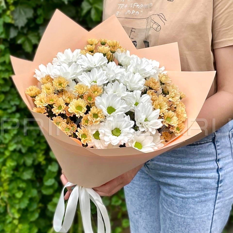 Bouquet of chamomile bush chrysanthemums and santini chrysanthemums with packaging.