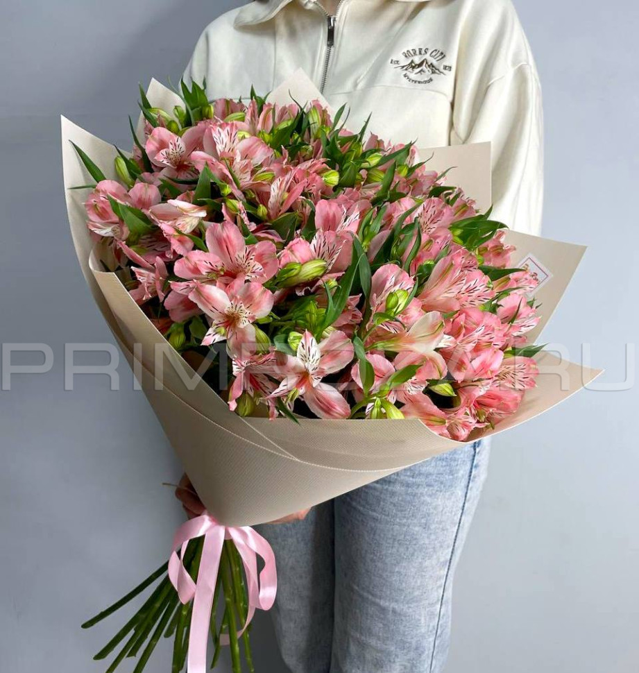 The bouquet uses multi-colored varieties of alstroemeria in a random selection (the shades may differ from the photos on the website).