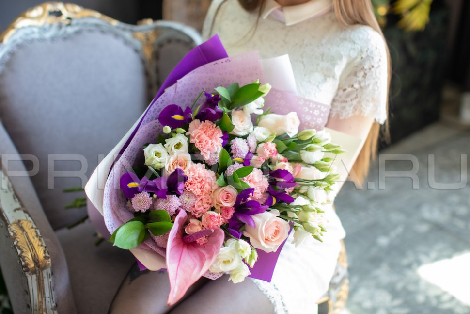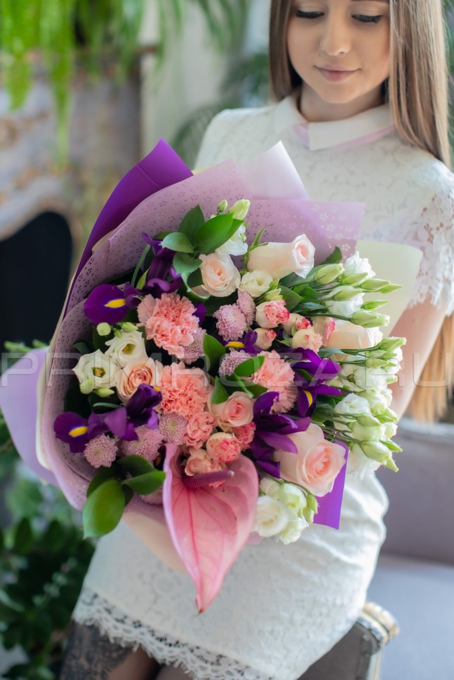 Anturium-1št., Roza 50sm - 5št., Эustoma - 5št., Гвоздика - 3št., Рускус - 5št., Хризантема кустовая - 3št., Ирис - 5št., Кустовая роза - 3št.
