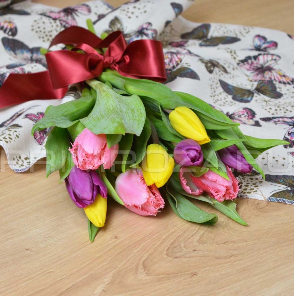 The bouquet contains 9 tulips wrapped in a ribbon or wrapped in a transparent film. Color mix!