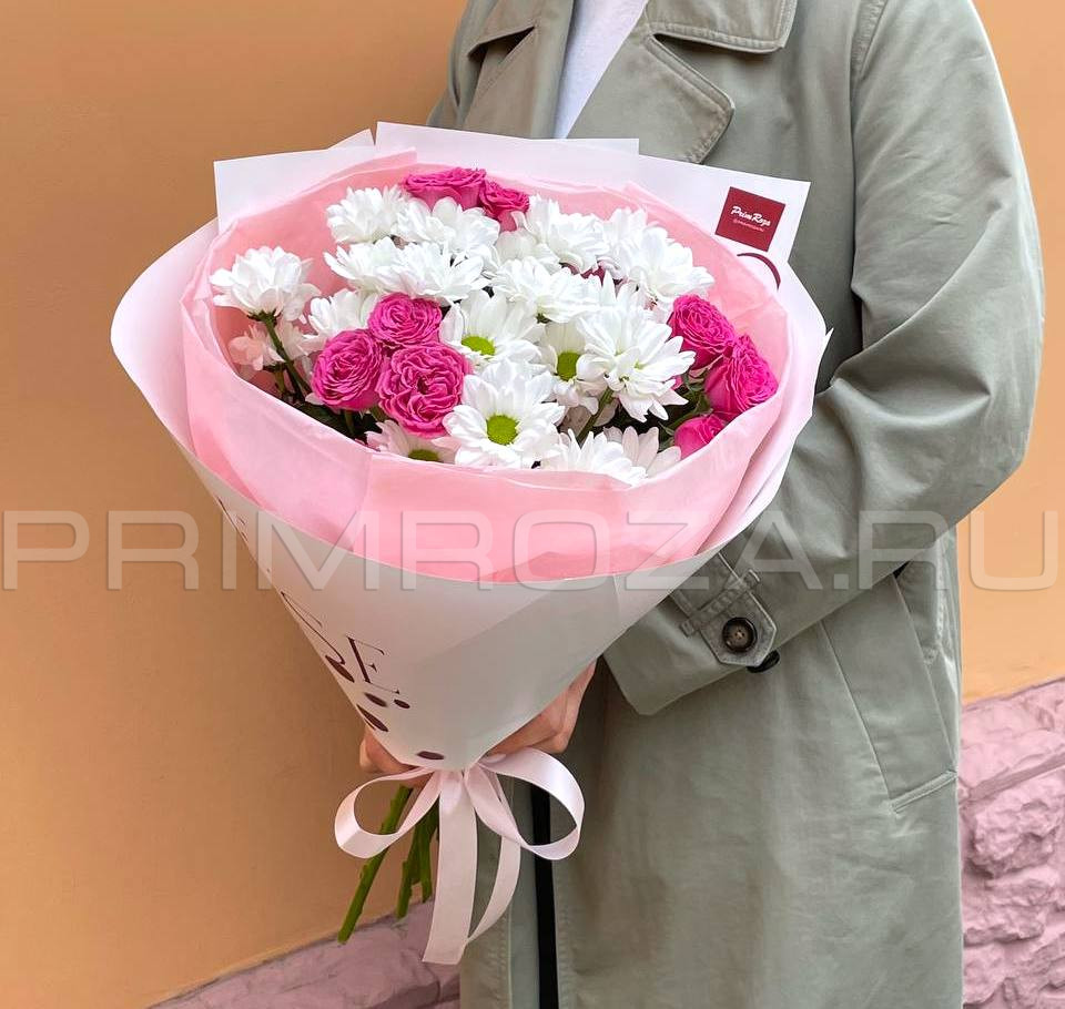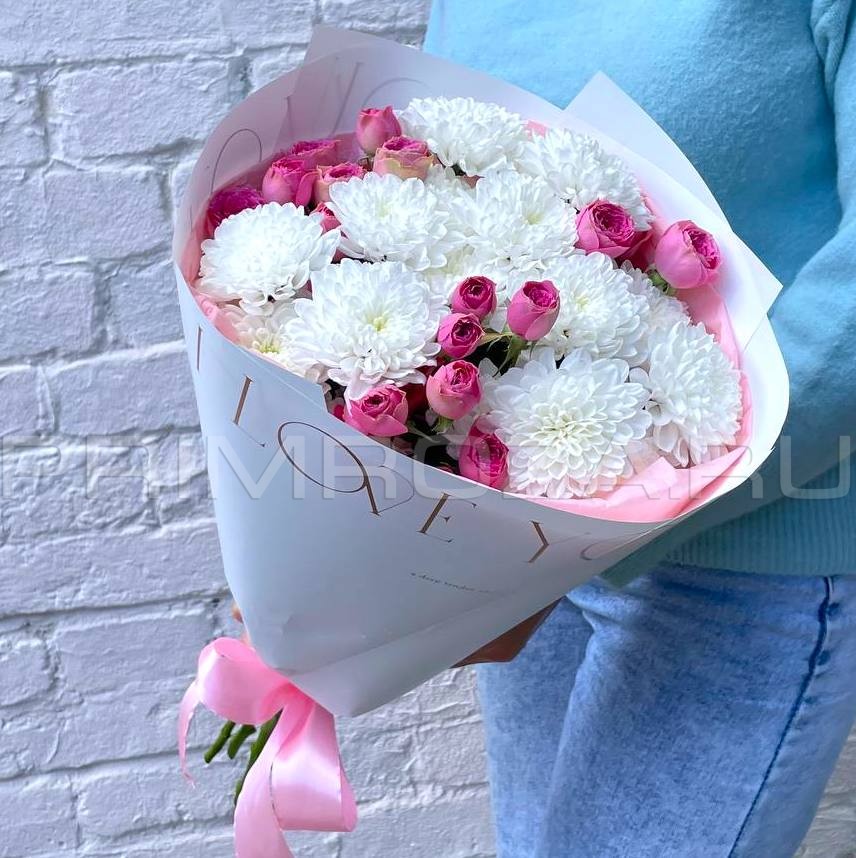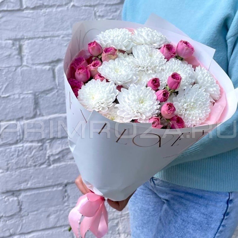 Хризантема -4, роза кустовая- 3, упаковка и лента- 1.